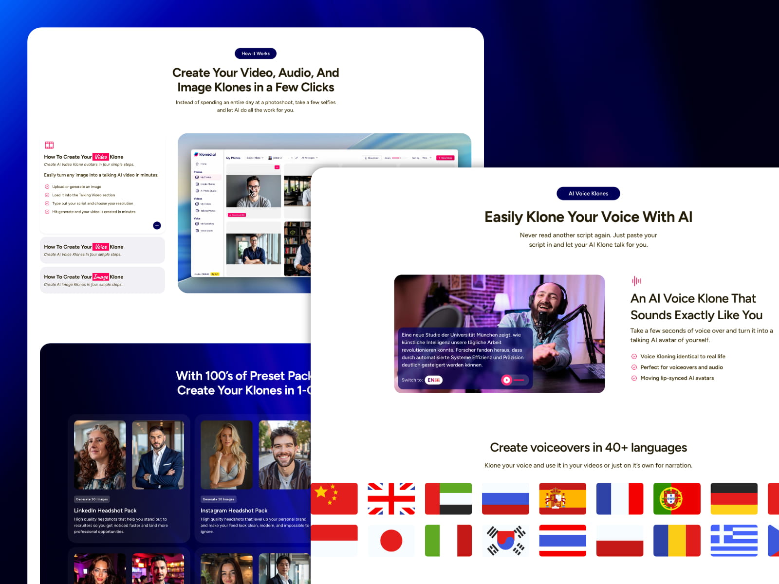 The final experience positions Kloned AI as an approachable yet powerful AI studio — enabling creators and brands to see themselves at the center of the technology.