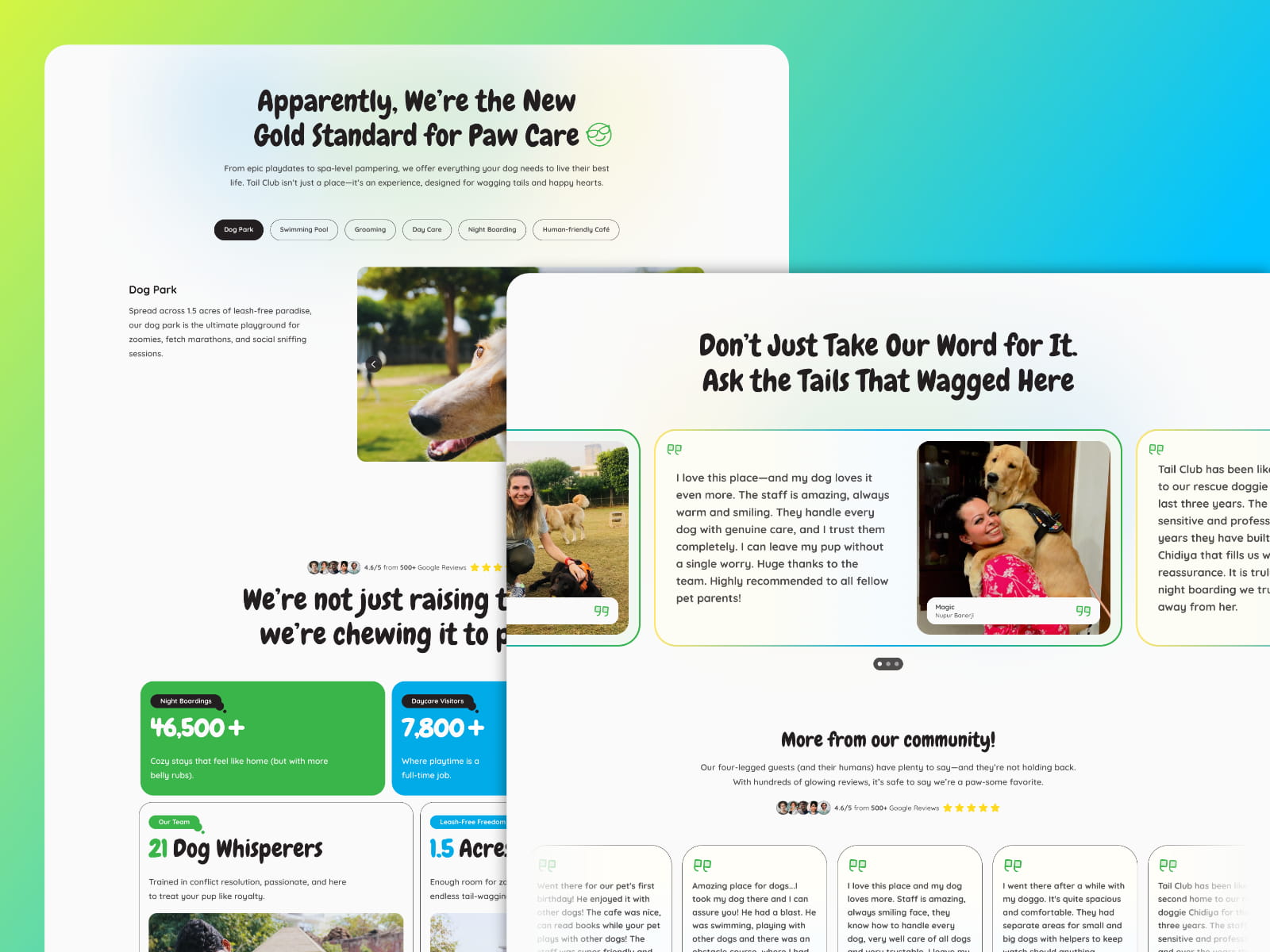 I led the UI/UX and website design for Tail Club, shaping an experience that prioritizes emotional connection and social proof over traditional feature-heavy marketing. The goal was to make visitors feel confident, reassured, and excited — before they ever book a visit.
